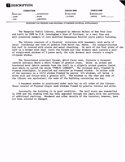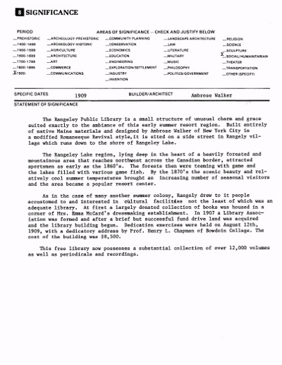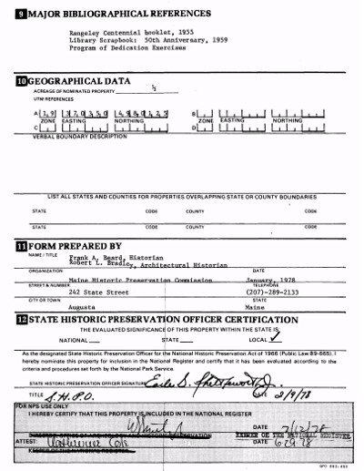 The Library building was dedicated on August 12, 1909. The charge desk, book stacks and computers are located in the attractive main room on the first floor. In 1959 a Children’s Room was furnished on the second floor through the generosity of Mrs. Frank Owen. On July 12, 1978 the Rangeley Public Library was honored by membership in the National Register of Historic Places.